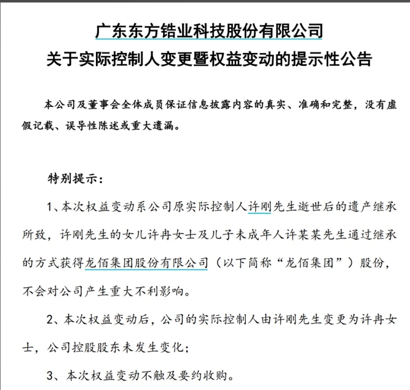 6月20日晚間,鈦白粉巨頭龍佰集團(002601)及其旗下東方鋯業(yè)(002167)同步披露,公司實際控制人變更為許冉。許冉系一名“90后”,她也是龍佰集團創(chuàng)始人、原實際控制人許剛先生的女兒。