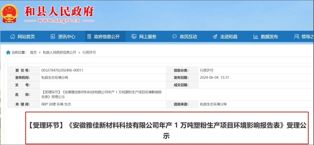近日,安徽馬鞍山市和縣生態(tài)環(huán)境分局對外發(fā)布《安徽雅佳新材料科技有限公司年產1萬噸塑粉生產項目環(huán)境影響報告表》受理公示。