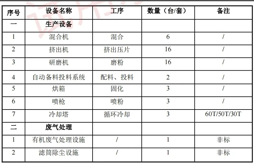項目主要生產設備、設施一覽表