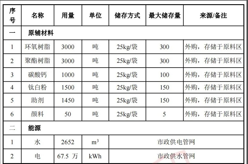項目主要原輔料及能源消耗一覽表