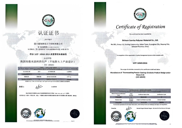 值得一提的是,在粉末涂料行業(yè),IATF16949證書一直被視為企業(yè)質(zhì)量管理水平的“金標(biāo)準(zhǔn)”。因其嚴(yán)格的認(rèn)證流程和極高的行業(yè)認(rèn)可度,許多企業(yè)望塵莫及。然而,桑瑞斯集團(tuán)卻成功獲得這一殊榮。標(biāo)志著其在質(zhì)量管理方面達(dá)到了國際先進(jìn)水平。