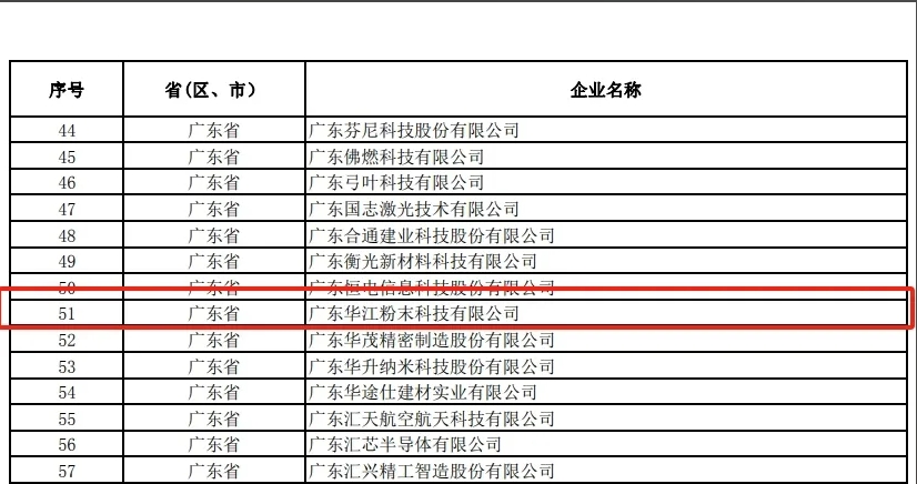近日,廣東省工業(yè)和信息化廳發(fā)布了關(guān)于廣東省第六批專精特新“小巨人”企業(yè)名單的公示,其中,廣東華江粉末科技有限公司、雅圖高新材料股份有限公司263家企業(yè)被認定為專精特新“小巨人”。