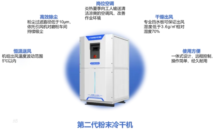 而對(duì)于單元式供冷,青風(fēng)還專門研發(fā)了第二代粉末冷干機(jī),在保證高效冷卻和干燥出風(fēng)的基礎(chǔ)上,針對(duì)性解決了粉末產(chǎn)線環(huán)境中粉塵大、除塵費(fèi)用高、夏季工作環(huán)境溫度高等痛點(diǎn)。