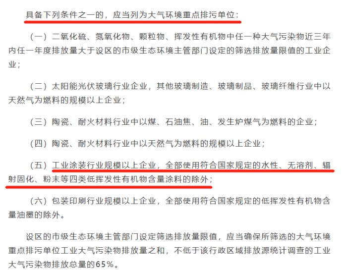 比如工業(yè)涂裝行業(yè),《辦法》要求將其中規(guī)模以上企業(yè)列為大氣環(huán)境重點排污單位,但是“全部使用符合國家規(guī)定的水性、無溶劑、輻射固化、粉末等四類低揮發(fā)性有機物含量涂料的除外”。