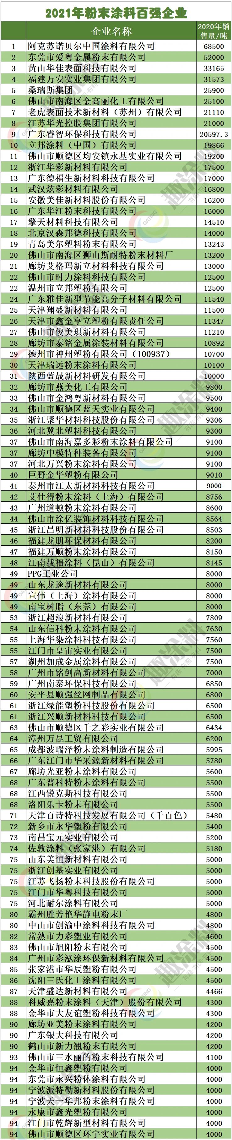 2021年度粉末涂料百?gòu)?qiáng)是一份衡量企業(yè)活力和未來(lái)創(chuàng)造價(jià)值能力的榜單。據(jù)統(tǒng)計(jì),今年排在粉末涂料百?gòu)?qiáng)榜前10名的企業(yè)分別是: